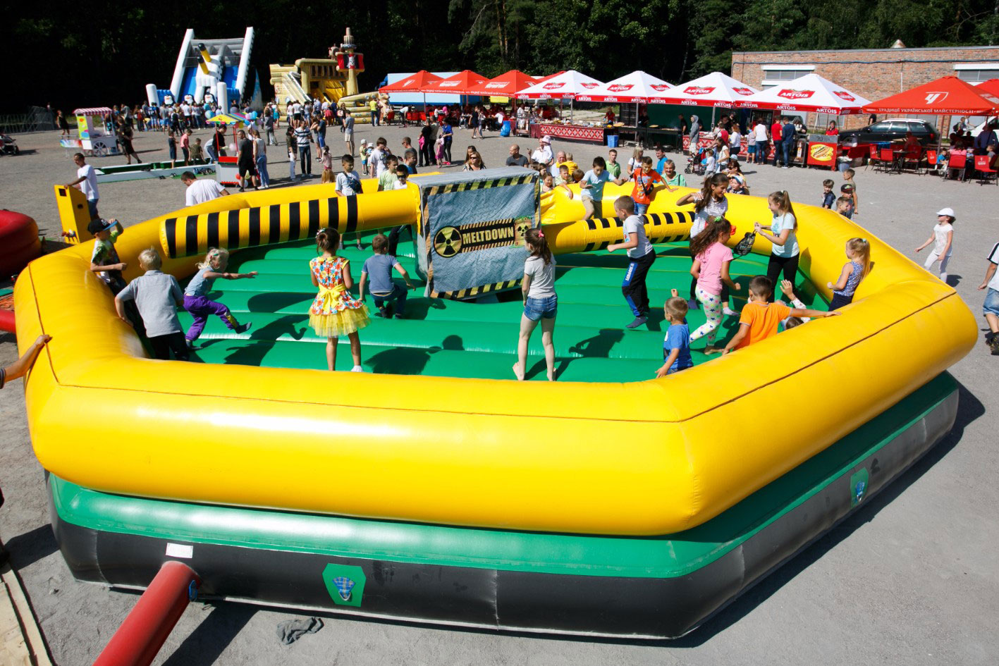 Хоча колоди і поролонові, але встояти під їх натиском складно – збиті учасники зі сміхом падають на безпечний надувний батут усередині майданчика.