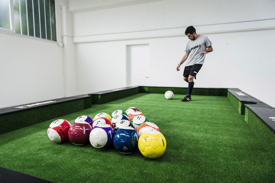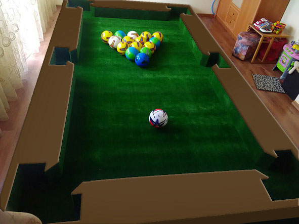 "Футбольний більярд" зовні нагадує більярдну стільницю. Однак вона встановлюється прямо на підлозі або на землі, без ніжок. Є лузи і є кулі для снукера, викладені на початку гри в більярдний трикутник. Начебто все зрозуміло. А тепер – найцікавіше! Застрибуйте на стіл і буцайте кульки ногами! Намагайтеся забити гол ударом у лузу!